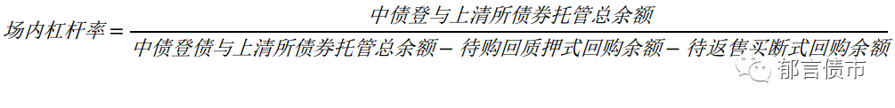 基于加杠杆的两种方式,债市杠杆主要分为场内杠杆和场外杠杆。其中场外杠杆的追溯受场外分级产品信息不公开、监管力度较弱、资金定价的市场化较弱等因素制约,本文将主要关注场内杠杆。场内杠杆的主要计算公式为: