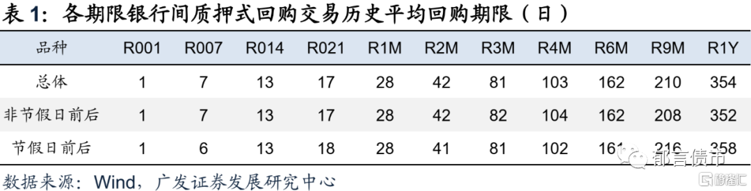 首先,计算各期限的银行间质押式回购交易的历史平均回购期限。在计算过程中我们考虑了法定节假日的影响,主要的历史平均回购期限如下表所示(保留整数)。