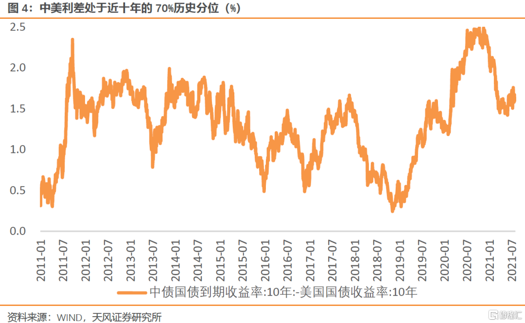根据中债登统计,今年1-7月境外机构在银行间累计增持国内债券4900亿,持债存量占比从去年底的3.9%提升至4.3%。其中7月增持753亿,外资加速配置中国债券。中美利差处于较高水平,当前中美10年国债利差达到160BP以上,处于最近十年的70%历史分位,利差有较大的可压缩空间;中德10年国债利差在300BP以上。