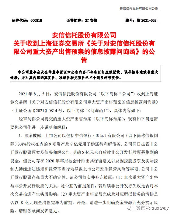 上交所要求安信信托收到本问询函后立即披露,并在 5 个交易日内,针对上述问题书面回复我部,并对重大资产出售预案作相应修改。