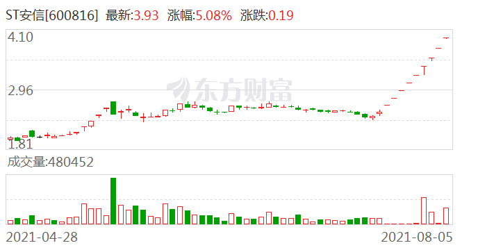 8月5日,ST安信收盘价为3.93元/股,涨5.08%。连续三个交易日内收盘价格涨幅偏离值累计超过15%,出现股票交易异常波动。