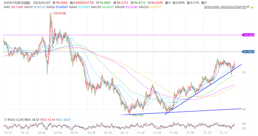 美联储1月议息会议强调购债步伐不变、3月结束QE,很快适合加息,明确了缩表的路径和对象,整体略偏鹰派,美元指数大幅拉升,最终收涨0.516%至96.5,距离96.94的近两年新高仅一步之遥。美国货币政策比欧洲偏鹰,经济比欧洲强,疫情控制比欧洲更有效,诸因素将会继续支撑着美元指数,故美元指数强势趋势将会持续。2022年,美元指数年内涨至97.8-98区间上方后,上探100-103区间的可能性较大。然而一旦美欧货币政策出现转向,即欧洲央行释放加息的信号,则欧元走强,美元指数则会转弱,再度下探88可能性是存在的,因此2022年美元指数整体的运行区间为88-103。