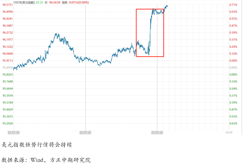 美联储1月议息会议强调购债步伐不变、3月结束QE,很快适合加息,释放略偏鹰派信号。美联储维持基准利率不变,每月购债规模不变,将在3月初结束QE;强调很快就会适当地加息,并且将在加息后开始缩表。通胀方面,供需失衡导致通胀高企,强调通胀率远高于2%。