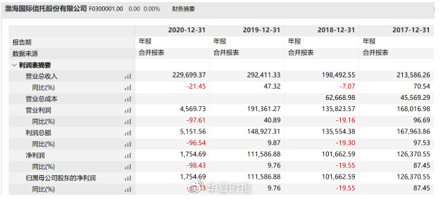在营收和净利方面,2020年,渤海信托实现营收22.97亿元,同比下降21.44%;净利润1754.69万元,下降幅度更高达98.43%。