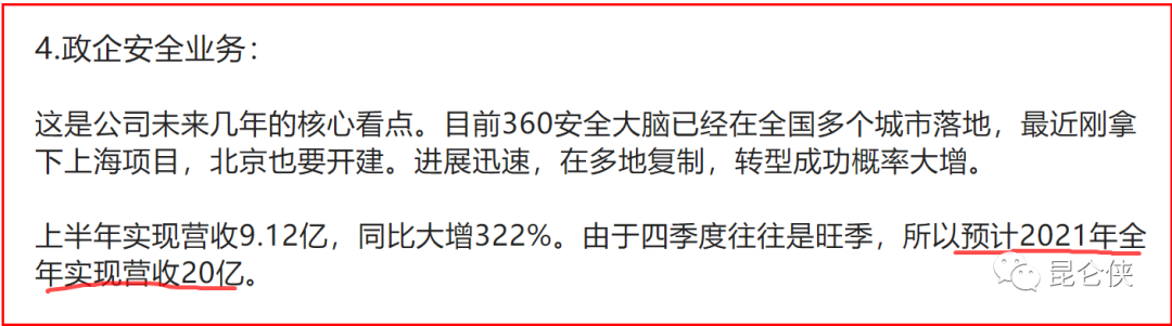政企安全业务是360公司未来3年的战略发展方向,所以报表重点跟踪的还是政企安全业务营业收入的增速以及毛利率情况。这个阶段不适合看净利润,已经失真了。最早也要等安全业务营收上40亿才有意义,也就是2023年以后了。