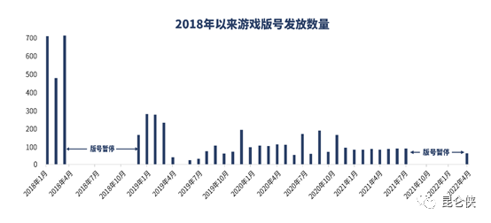 原因先前已经讲过,主要是监管部门要求游戏厂商对未成年人沉迷游戏问题进行持续改进。2021年7月份起游戏版号暂停,直到2022年4月才重启,历时9个月,和2018年接近。