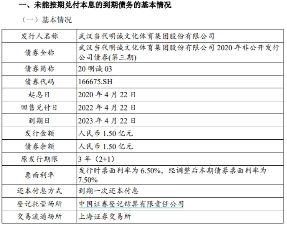 截至目前,应于2022年4月22日支付的“20明诚03”1.13亿元的回售本金及2021年4月22日至2022年4月21日期间的全额利息未按期划付至中国证券登记结算有限责任公司上海分公司,金额1.23亿元。