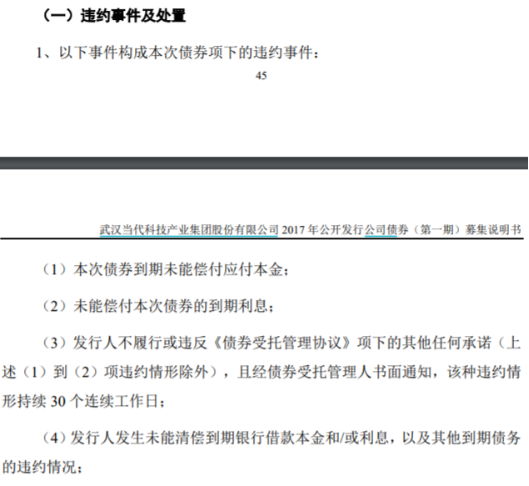 据募集说明书显示,当代集团存续的2只公司债“17当代01”及“18当代02”在“违约事件及处置”中明确约定,“发行人发生未能清偿到期银行借款本金和/或利息,以及其他到期债务的违约情况”。