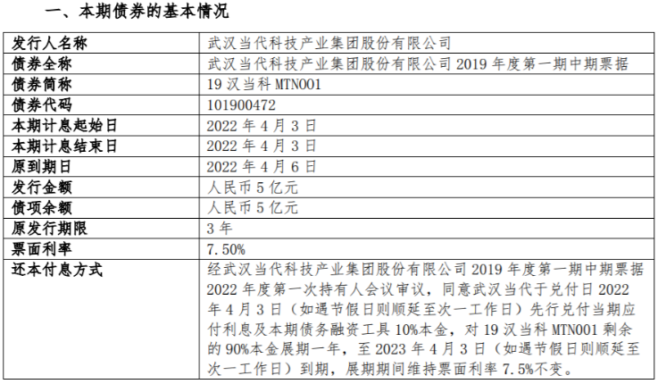 据公开资料,“19汉当科MTN001”发行于2019年4月,发行规模5亿元,票息7.5%,本应于2022年4月3日到期,遇节假日顺延至2022年4月6日。