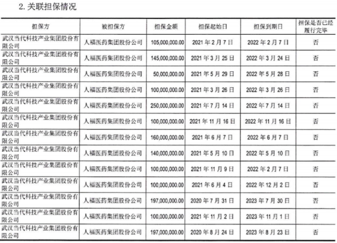 据人福医药2021年财报显示,2021年末当代集团为人福医药借款提供担保金额高达17.44亿元,“捆绑”较为紧密,随着当代集团债务违约,将对人福医药再融资产生一定影响。