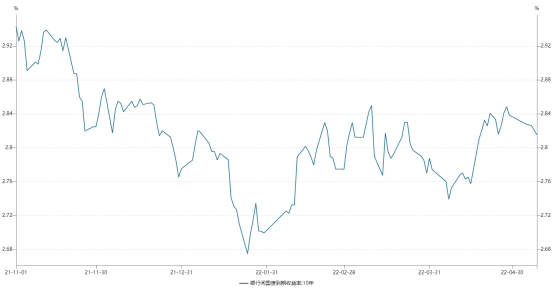 今年以来,10年期国债收益率表现平稳,在2.6%至2.9%范围内波动,最高至2.86%,债券收益率整体呈现底部震荡走势。截至5月9日,10年期国债收益率较上年末仅上行6个基点。10日上午,银行间市场10年期国债活跃券成交在2.81%附近。