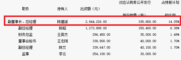 广州浪奇2016年1月27日发布的《发行情况报告暨上市公告书》显示,本次非公开发行的发行对象浪奇资管计划,由广州证券设立和管理,由广州浪奇2014年度员工持股计划以包括公司董事、监事、高级管理人员陈建斌邓在内的33名员工用于认购员工持股计划份额的出资额1996.00万元认购。公司董事、监事和高级管理人员在浪奇资管计划中的出资额及对应的股份数量如下表所示: