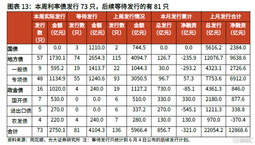 5.1、一级市场:本周利率债总发行量和净融资额分别为2750.1、809.5亿元,后续等待发行利率债有81只