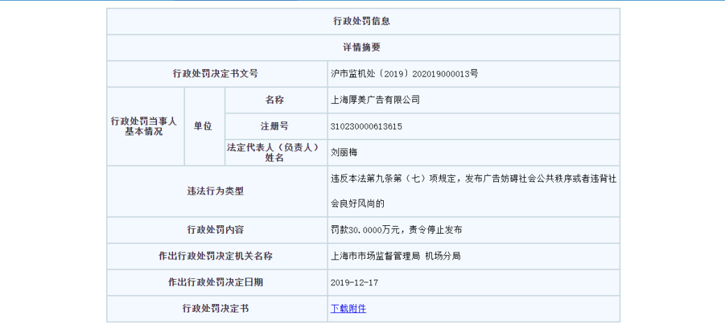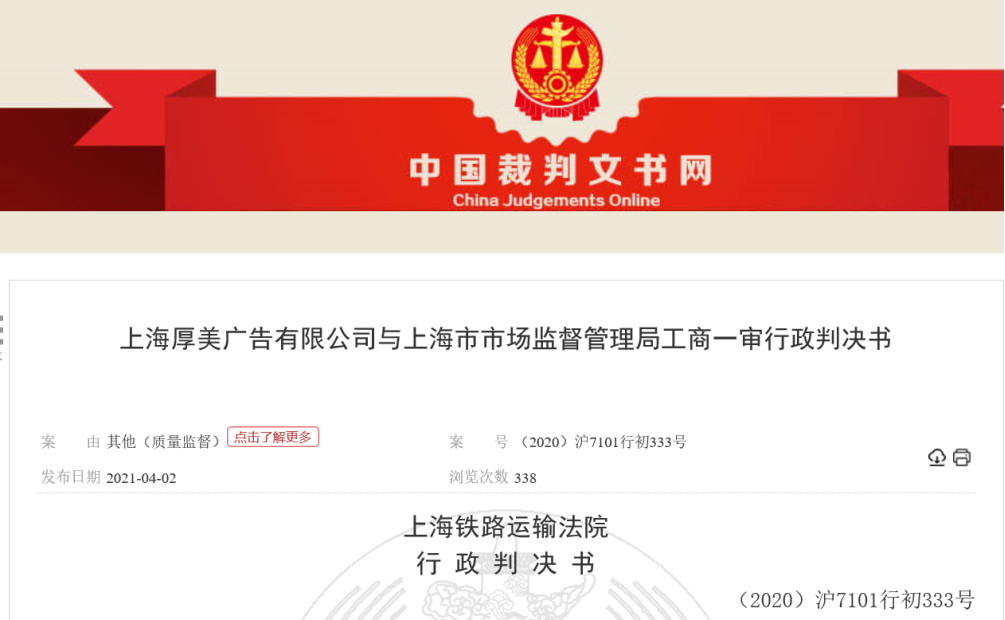2020年5月,上海厚美广告有限公司不服,诉至法院,要求撤销上述行政处罚。上海铁路运输法院认为,案涉广告内容从其字面意思来看,的确存在哗众取宠、低级庸俗以吸引眼球之嫌,有违公序良俗,易产生负面效应。上海市市场监督管理局作出被诉行政处罚决定,认定事实清楚,证据确实充分,适用法律正确,裁量并无明显不当,驳回原告上海厚美广告有限公司的诉讼请求。