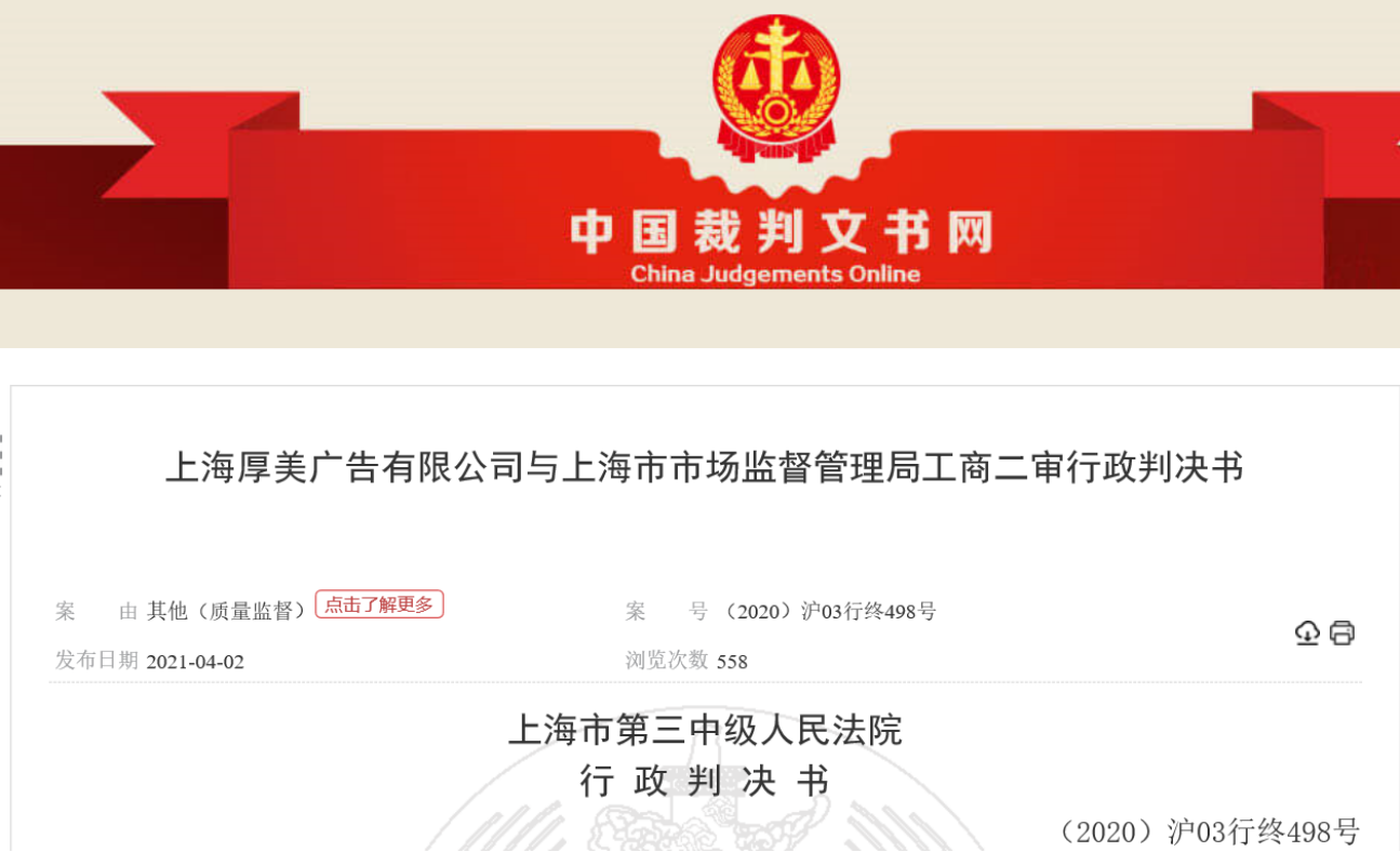 2020年10月,上海厚美广告有限公司不服一审判决,上诉至上海市第三中级人民法院。经审理,法院维持原判,驳回其上诉请求。