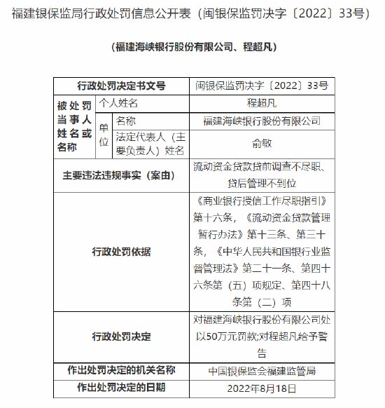 8月25日消息,据中国银保监会福建银保监局行政处罚信息公开表显示,福建海峡银行股份有限公司因存在流动资金贷款贷前调查不尽职、贷后管理不到位的行为,被处以50万元罚款;该行程超凡被处以警告。