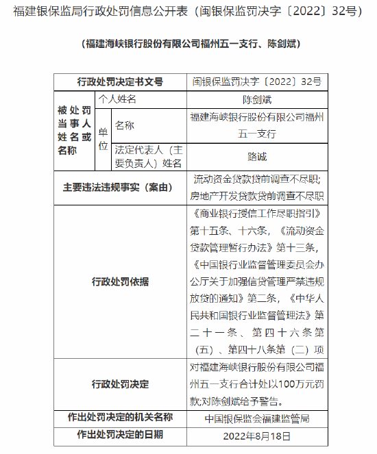 此外,福建海峡银行股份有限公司福州五一支行因涉及流动资金贷款贷前调查不尽职、房地产开发贷款贷前调查不尽职的行为,被处以100万元罚款;该支行陈剑斌被处以警告。